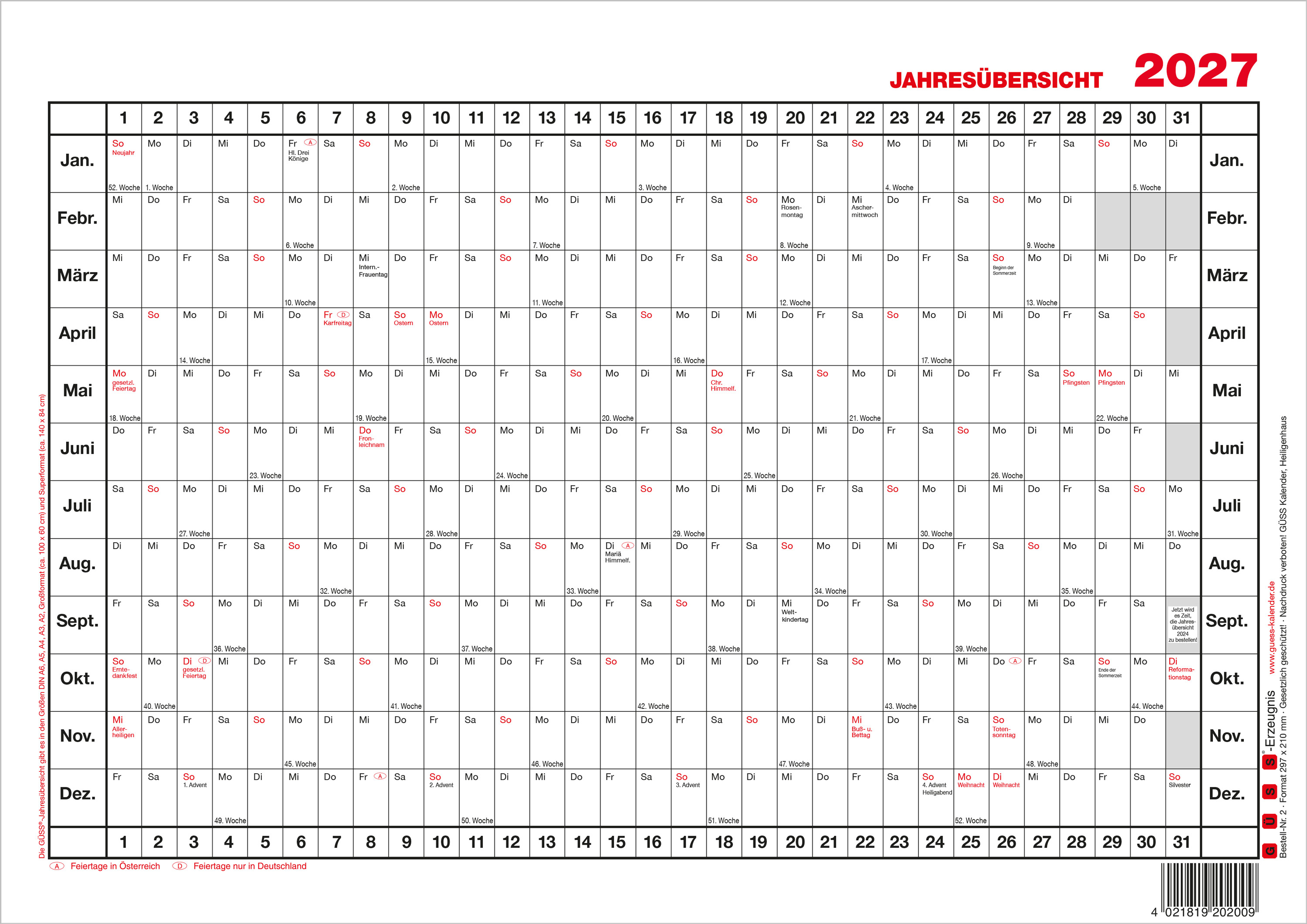 Die einzige Jahresübersicht zum Eintragen über mehrere Tage, hochwertiger Karton, Querformat, Sonn- und Feiertage rot, Schulferienübersicht ab DIN A2
