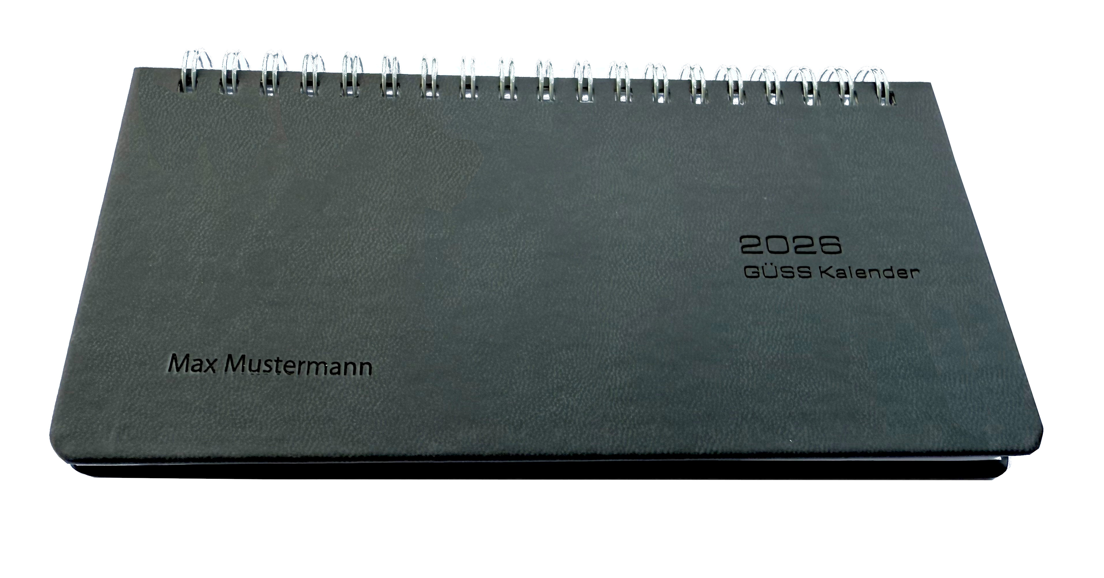 Tisch-/Taschenkalender mit Tucson-Einband, Wire-O und einer Woche auf 2 Seiten, 144 Seiten, Kalendarium deutsch, pro Tag eine Spalte - Sa./So. eine Spalte, 8.00-19.00, 2-farbiger Druck, Einband Tucson, Runde Ecken, Blindprägung Jahreszahl und GÜSS Kalender, Wire-O-Bindung silber, Eckenperforation, Vor- und Hintersatz mit: Jahresübersichten aktuelles + Folgejahr, Schulferienübersicht (D/A/CH), Monatsübersicht (2 Monate=1 Seite), Kontakte